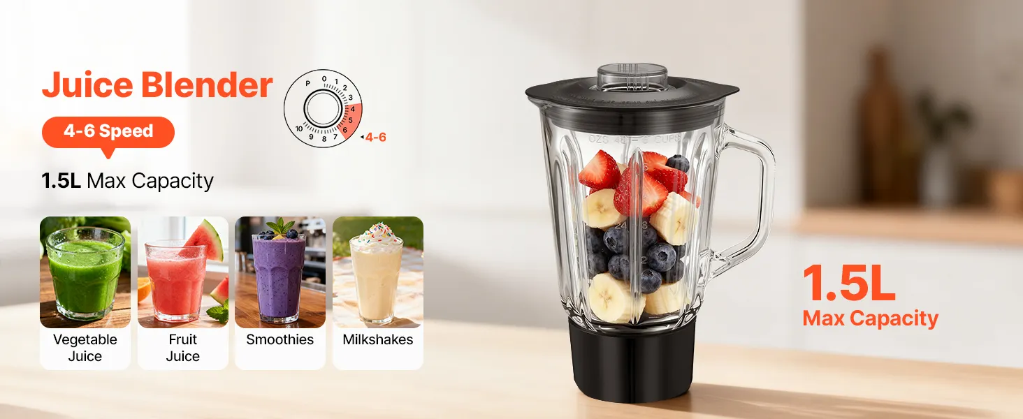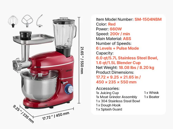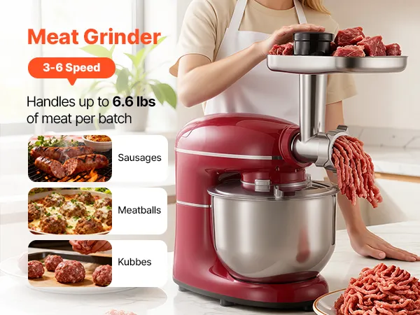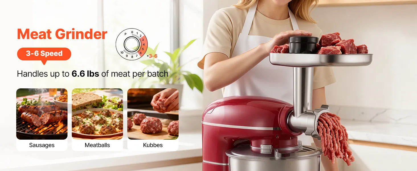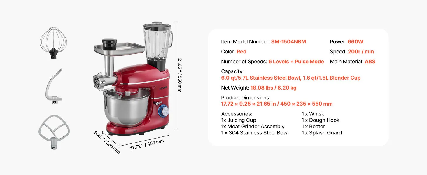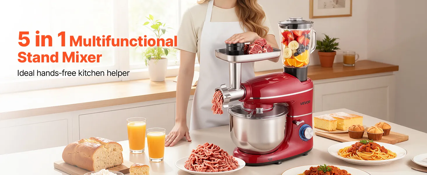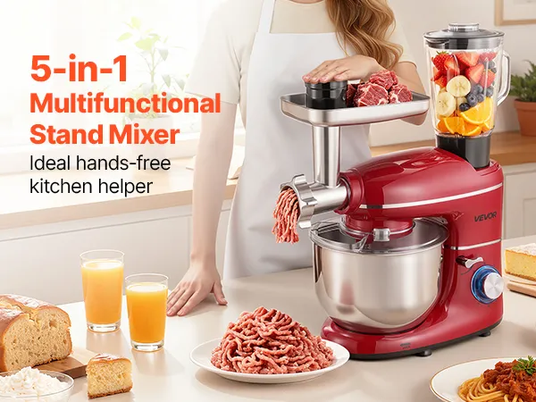 5-in-1 Commercial Stand Mixer: Our stand mixer combines 5 tools in one for effortless food prep. It includes a dough hook for kneading, a whisk for whipping, and a beater for versatile mixing tasks. Also, use the meat grinder for sausages and burgers and the 1.5 L juice blender for fresh smoothies