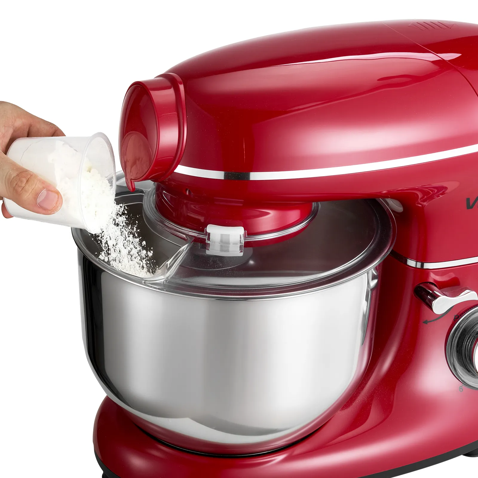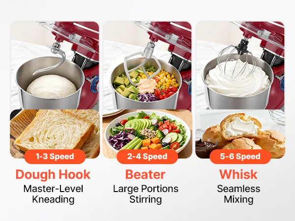 Large Bowl & 3 Attachments: Large Capacity Bowl: Our commercial food stand mixer includes a spacious stainless steel bowl of 6 qt (5.7 L), so you can mix large batches of dough, bake chocolate chip cookies, prepare fresh bread, or even mashed potatoes for your next big meal