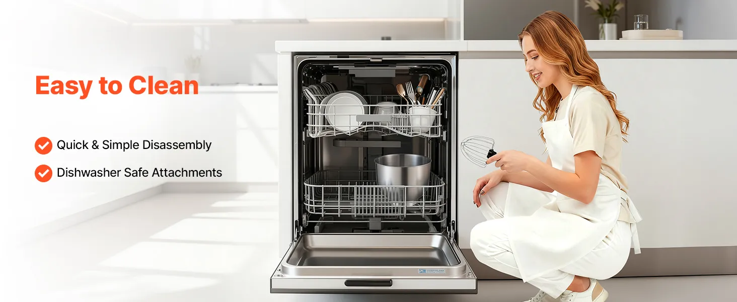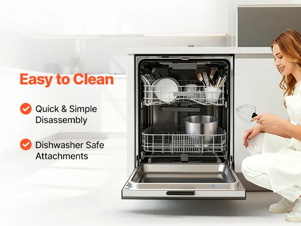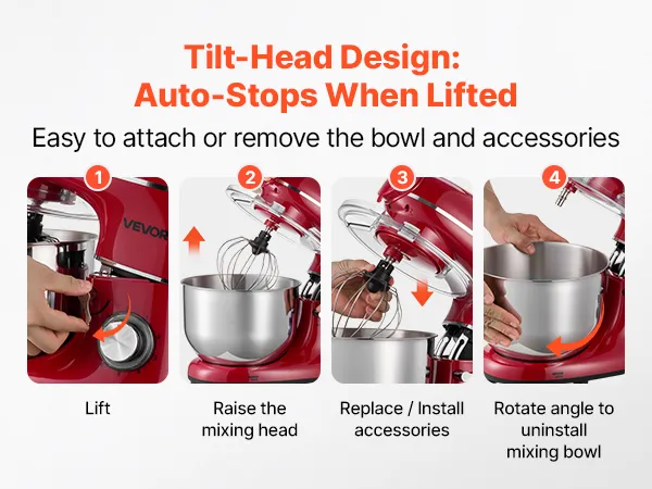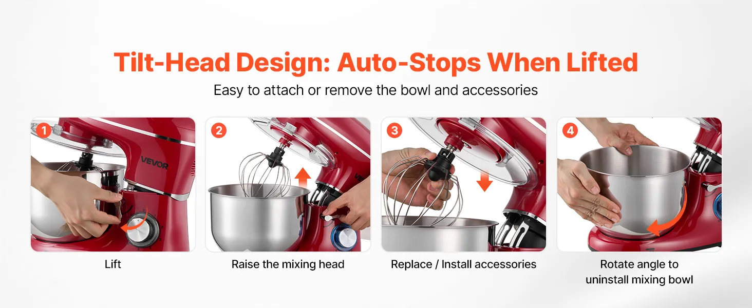 Easy to Detach and Clean: One-touch tilt-head auto-stops when lifted, allowing easy attachment or removal of mixing tools. Twist and lift the bowl to detach. Accessories including the bowl, hook, and rod are made of food-grade stainless steel and are dishwasher-safe