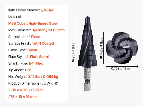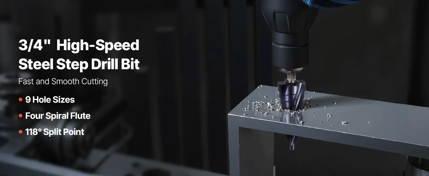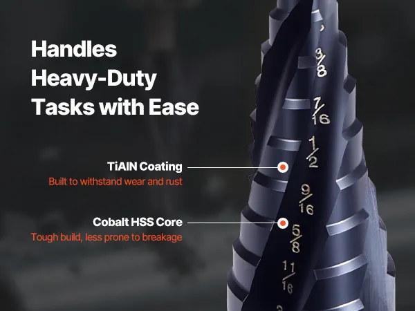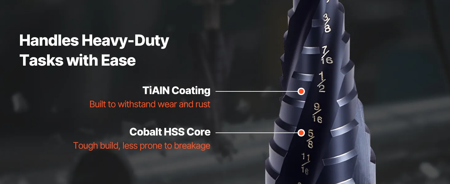 Long-Lasting Sharpness: The step bit is made of cobalt high-speed steel with an AlTiN coating to withstand wear and stay sharp. It is ideal for stainless steel, metal sheets, and other tough materials