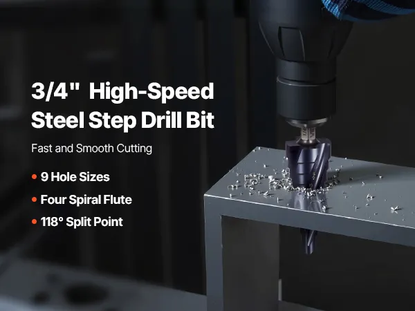 Multi-Size Versatility: This step drill bit includes nine precise sizes from 1/4 to 3/4 inch(1/4, 5/16, 3/8, 7/16, 1/2, 9/16, 5/8, 11/16, 3/4 inch) to handle diverse drilling needs. Minimal bit changes help maintain an efficient workflow across projects