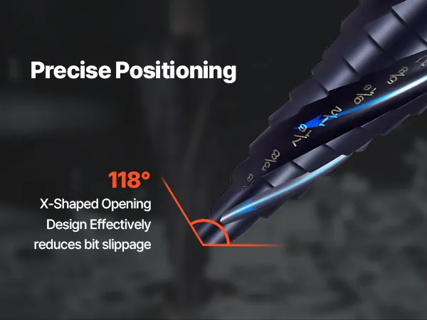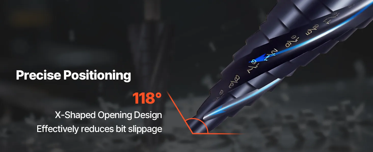 The metal step drill bit for metal features a 118° design to provide accurate positioning and smoother starts. The sharp tip minimizes bit walking, ensuring each hole is drilled exactly where you want it.