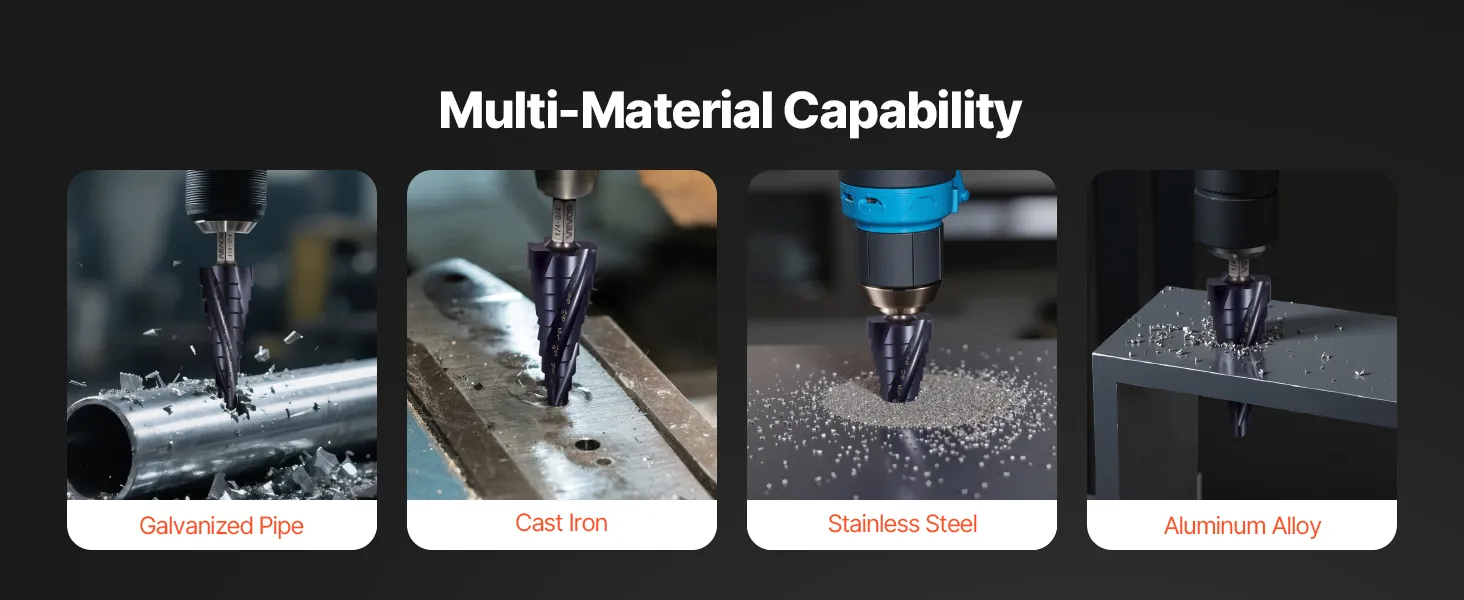 Wide Application: For materials up to 1/8" (3 mm) thick, this step drill bit for stainless steel works seamlessly on stainless steel, sheet metal, wood, plastic, and fiberglass. It is essential for both home renovation and industrial applications