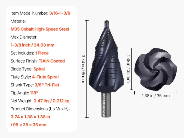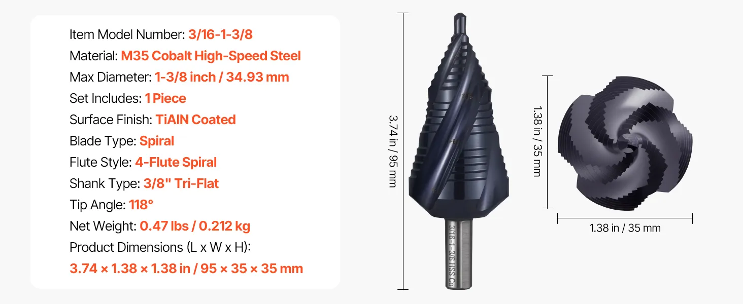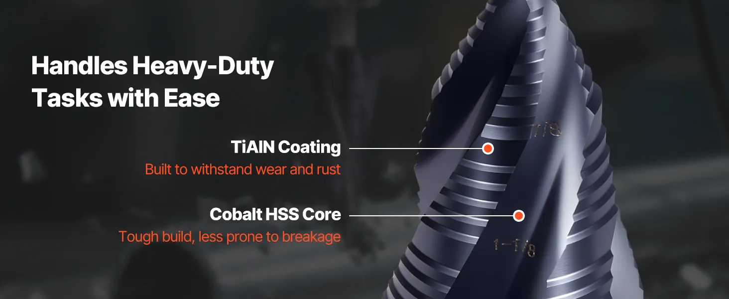 Long-Lasting Sharpness: The step bit is made of cobalt high-speed steel with an AlTiN coating to withstand wear and stay sharp. It is ideal for stainless steel, metal sheets, and other tough materials