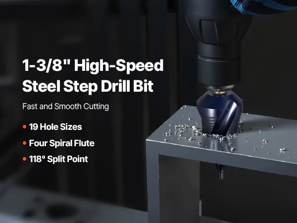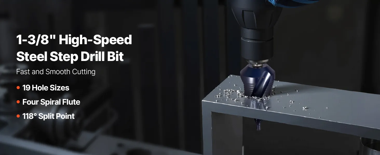 Multi-Size Versatility: This step drill bit includes nineteen precise sizes from 3/16 to 1-3/8 inch to handle diverse drilling needs. Minimal bit changes help maintain an efficient workflow across projects