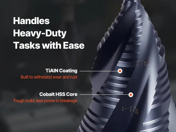 Our step bit is coated with TiAlN for high hardness and smooth cutting, and crafted from cobalt high-speed steel with heat treatment for superior strength and toughness. Designed for both professional metalworking and DIY projects, it delivers a long service life.