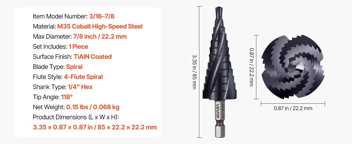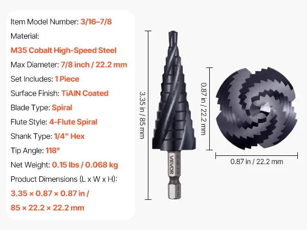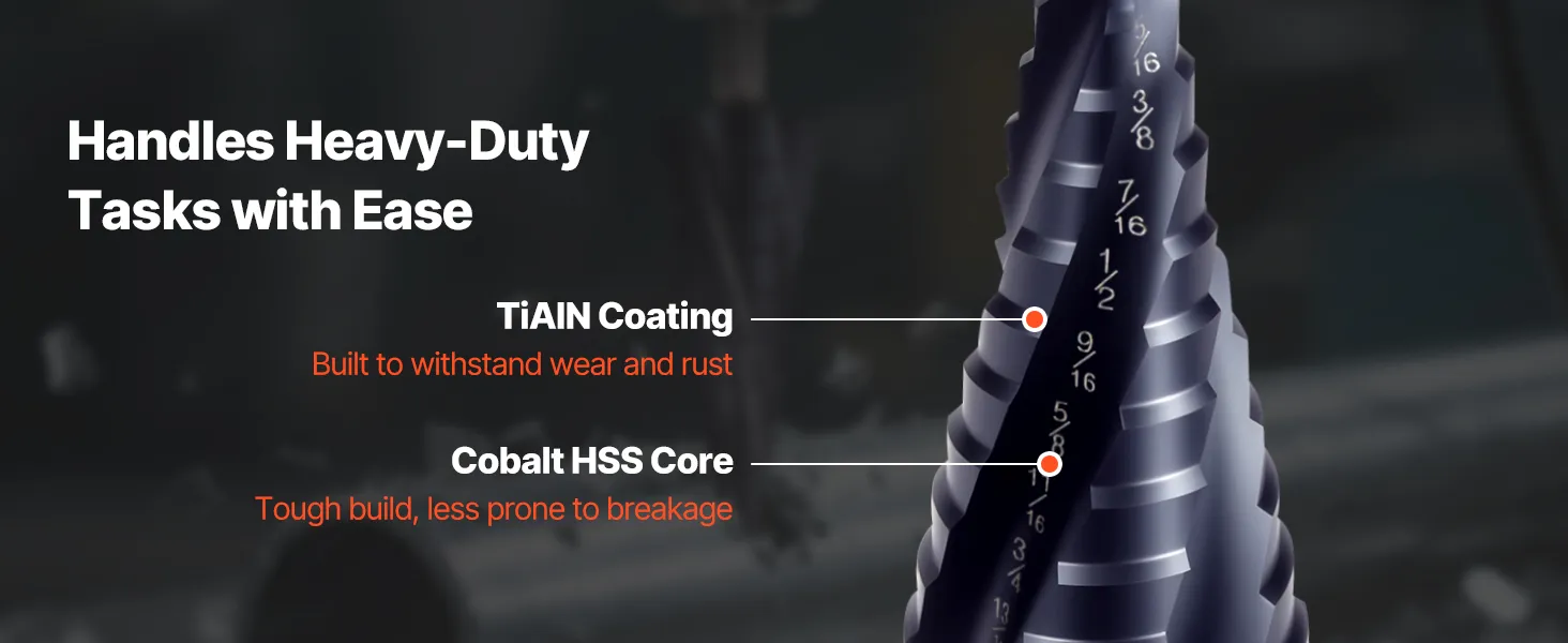 Long-Lasting Sharpness: The step bit is made of cobalt high-speed steel with an AlTiN coating to withstand wear and stay sharp. It is ideal for stainless steel, metal sheets, and other tough materials