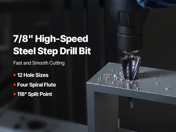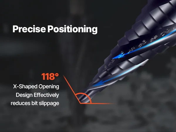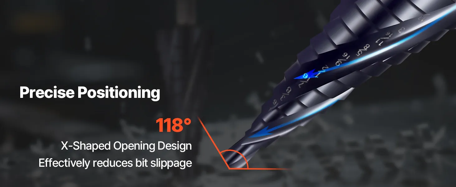 The metal step drill bit for metal features a 118° design to provide accurate positioning and smoother starts. The sharp tip minimizes bit walking, ensuring each hole is drilled exactly where you want it.