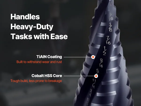 Our step bit is coated with TiAlN for high hardness and smooth cutting, and crafted from cobalt high-speed steel with heat treatment for superior strength and toughness. Designed for both professional metalworking and DIY projects, it delivers a long service life.