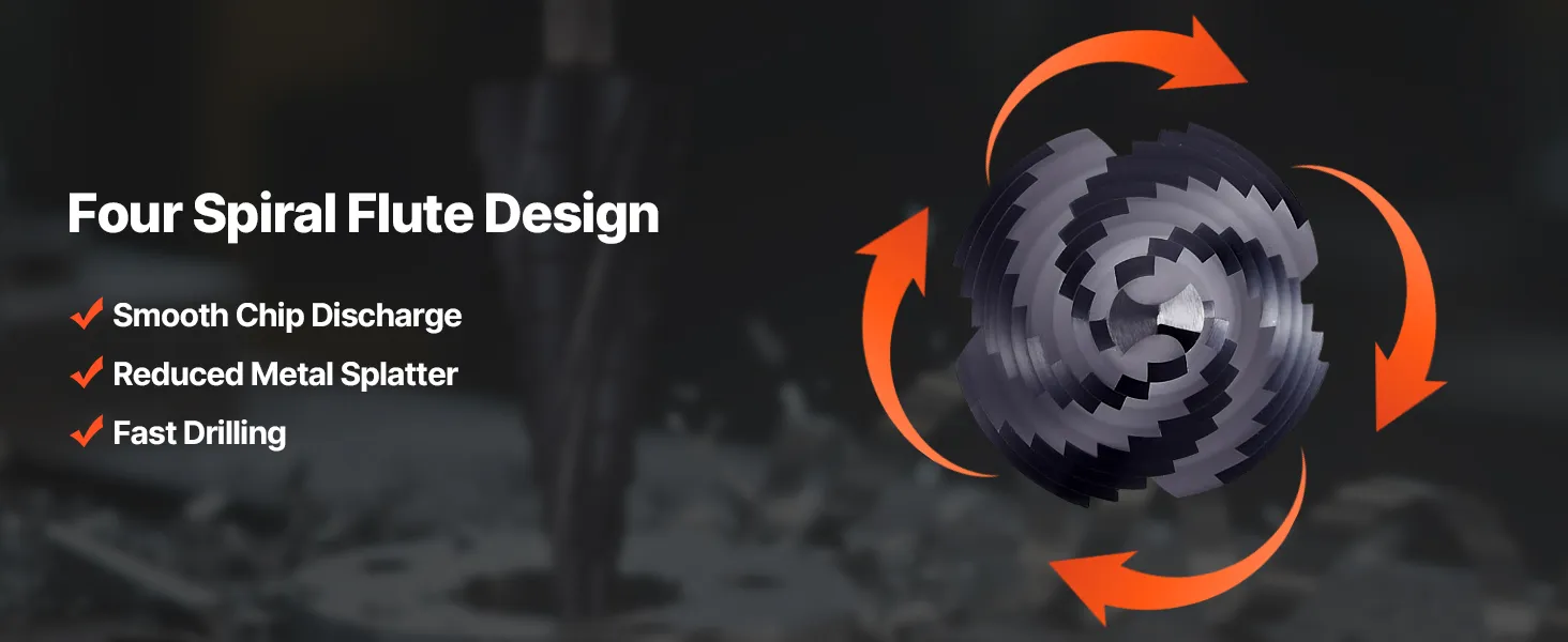 Four spiral flutes speed up chip evacuation for smoother, uninterrupted drilling, especially on hard materials. Our step drill bit for metal helps achieve cleaner, more precise holes.