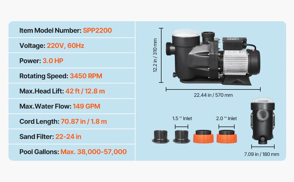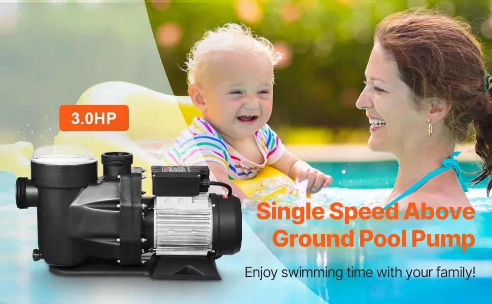 3 HP Premium Copper Motor: Voltage: 220V / 60 Hz. Powered by a pure copper motor, this above ground pool pump ensures efficient and stable operation with built-in thermal protection. It's ideal for continuous water filtration, keeping your pool clean and clear. Note: Plug Not Included