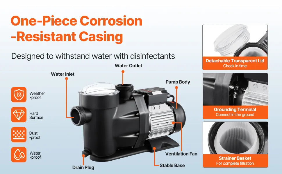 Corrosion-Resistant Thickened Shell: Unlike other pumps, our swimming pool pump features a PP shell that resists harmful substances. The integrated structure ensures a leak-free, wear-resistant design, making it suitable for use with chlorinated water