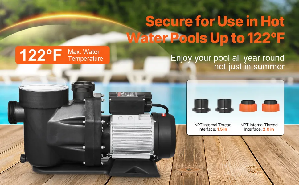 This pool pump is designed for water temperatures ranging from 32℉ to 122℉ (0 to 50℃), making it fit for above-ground pools, hot tubs, spas (including saltwater pools), and irrigation systems.
