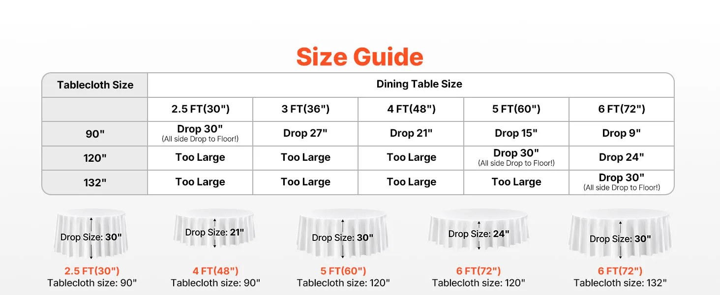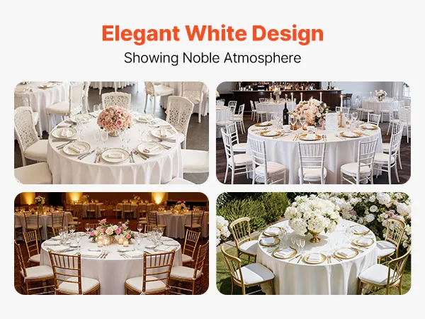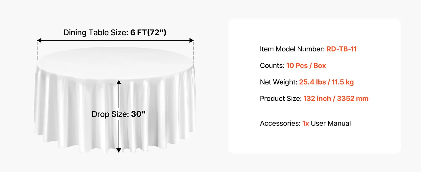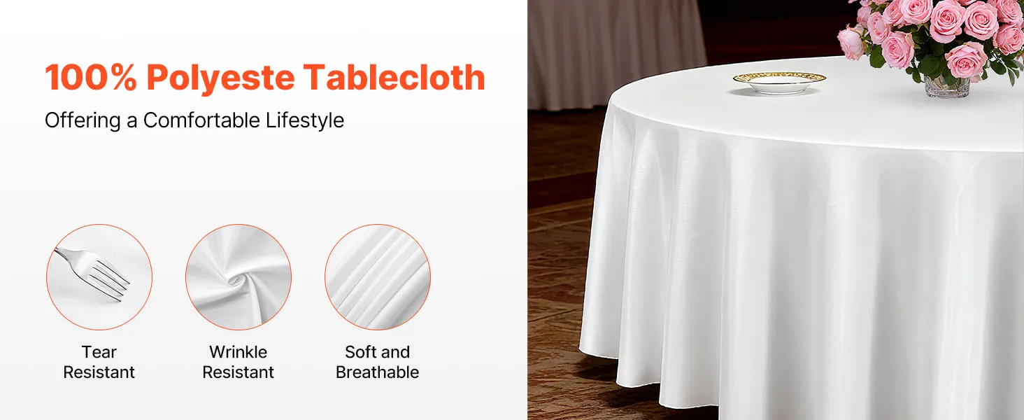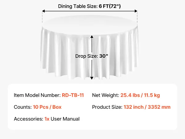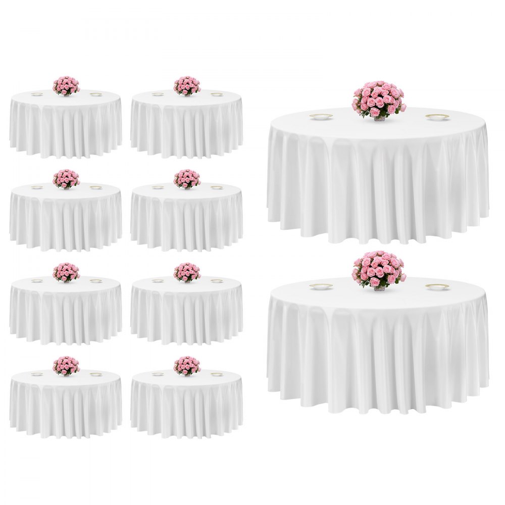 Round Tablecloth Set: This round tablecloth helps protect against spills, stains, and scratches. The package includes 10 packs of white polyester round tablecloths, each 132 inches in diameter. Stylish and versatile. Please measure your table size before purchase and refer to our size chart for the best fit