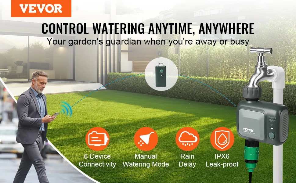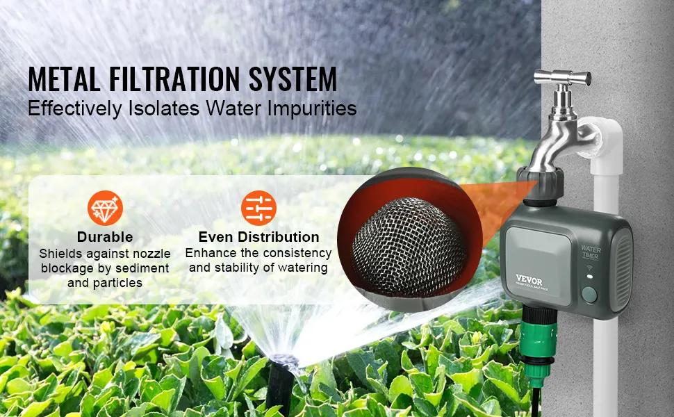 The smart hose faucet timer is designed to save water by delaying the rainy periods. You can easily manage your watering schedule with app control via 2.4GHz WiFi or Bluetooth. It doesn’t matter if you're at home or on vacation. You can monitor and adjust your watering schedule now that it's time to maintain a lush green lawn and healthy garden. Your plants aren't overwatered. This feature helps you avoid getting swampy during harsh weather conditions. IPX6 waterproof rating ensures durability and reliability even in extreme environments. Our built-in filter effectively removes sediment and particles. So, it provides clean water for your plants and prevents clogs. The durations and frequencies allow you to customize your irrigation schedule according to your needs. That means your plants get the needed water without worrying about being stuck. Even if you cannot monitor from home, the VEVOR WiFi sprinkler timer is perfect for anyone who wants smart, efficient, and reliable yard watering.