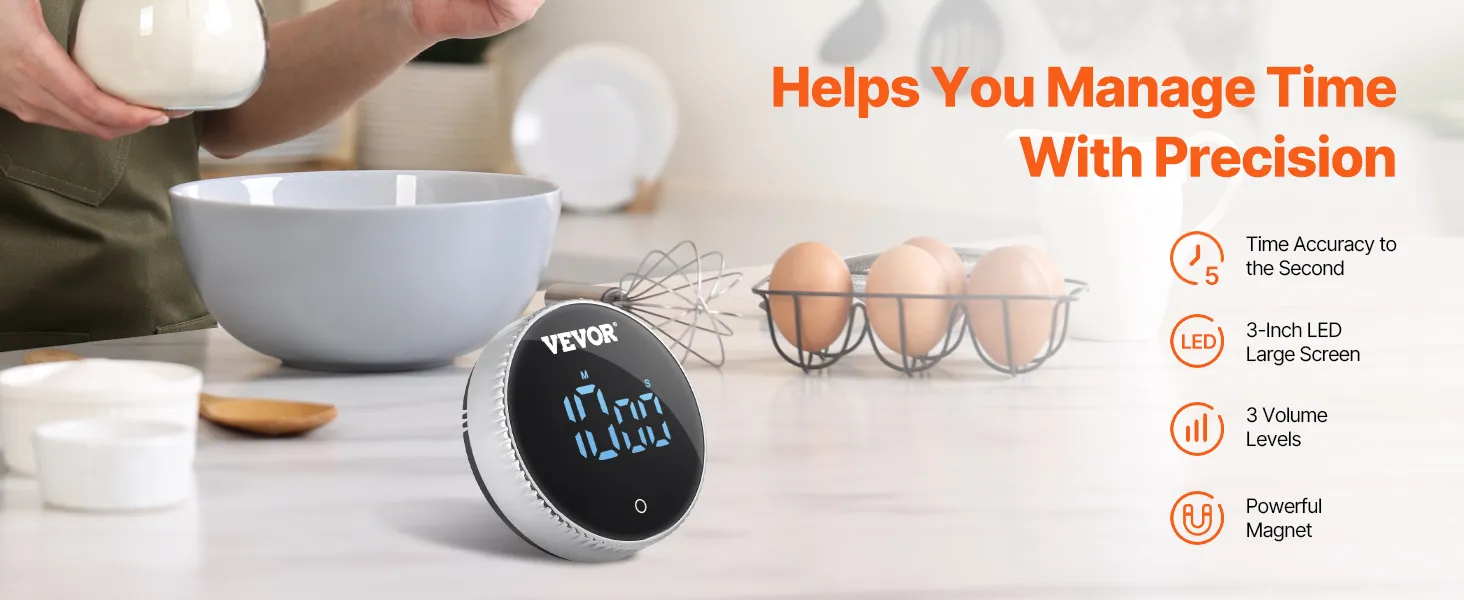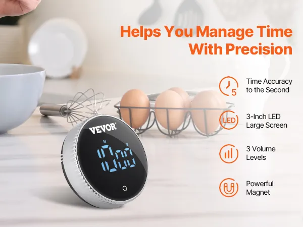 El temporizador de cocina magnético VEVOR con gran pantalla LED cuenta con una pantalla de 3 pulgadas, tres niveles de volumen y dos modos de iluminación. Ya sea cocinando o estudiando, configura el volumen perfecto. Sus potentes imanes se adhieren firmemente a refrigeradores y hornos, liberando espacio y facilitando el ajuste de la hora con una sola mano.