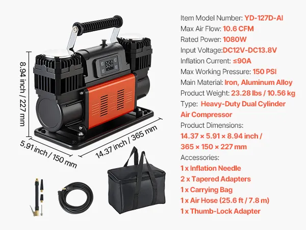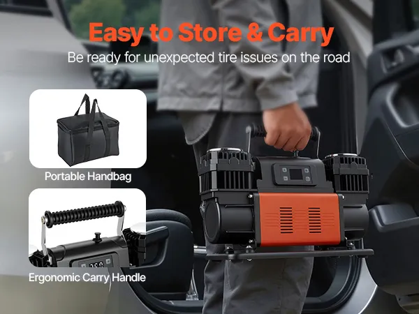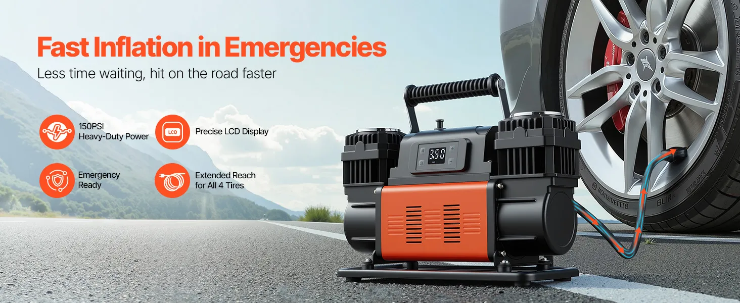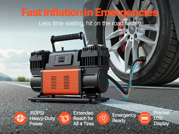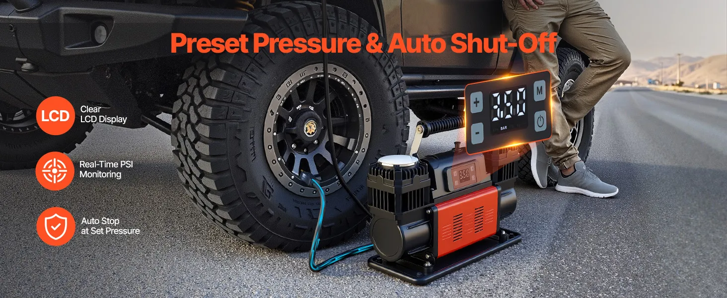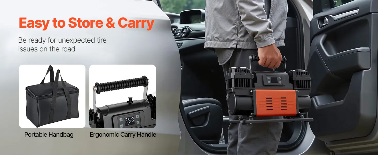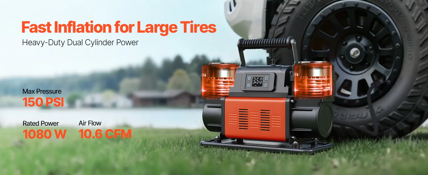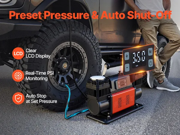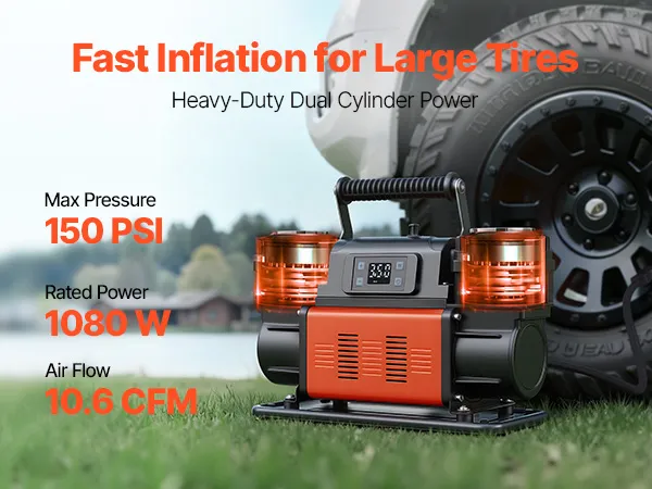 El compresor de aire VEVOR de 12 V para trabajo pesado es tu compañero ideal para los viajes. Con diseño de doble cilindro, presión preestablecida y función de parada automática, pantalla LCD digital clara, flujo de aire de 10.6 CFM y presión máxima de 150 PSI, infla los neumáticos de forma eficiente, permitiéndote retomar el camino rápidamente.