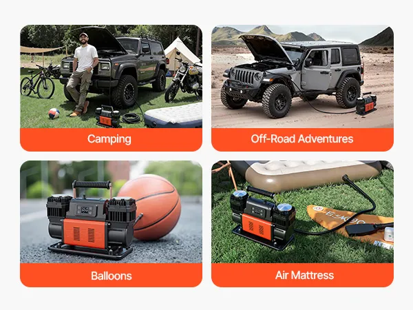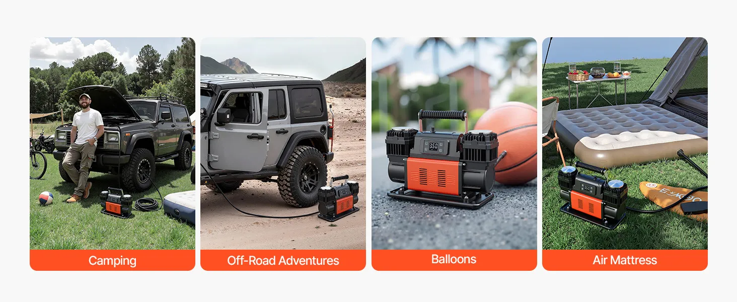 Equipado con adaptadores de inflado, este compresor de aire portátil es versátil para automóviles, SUV, camiones y vehículos recreativos, y también es adecuado para motocicletas, bicicletas, balones deportivos, juguetes inflables, colchones de aire y más.