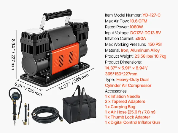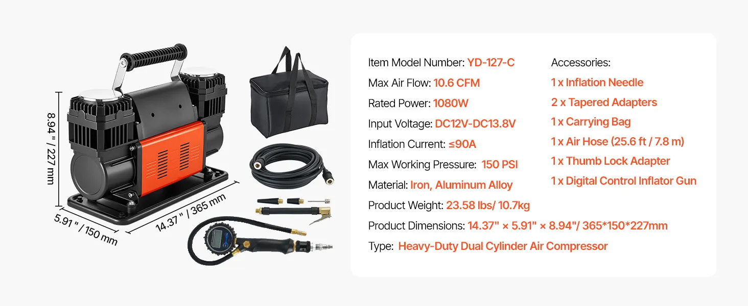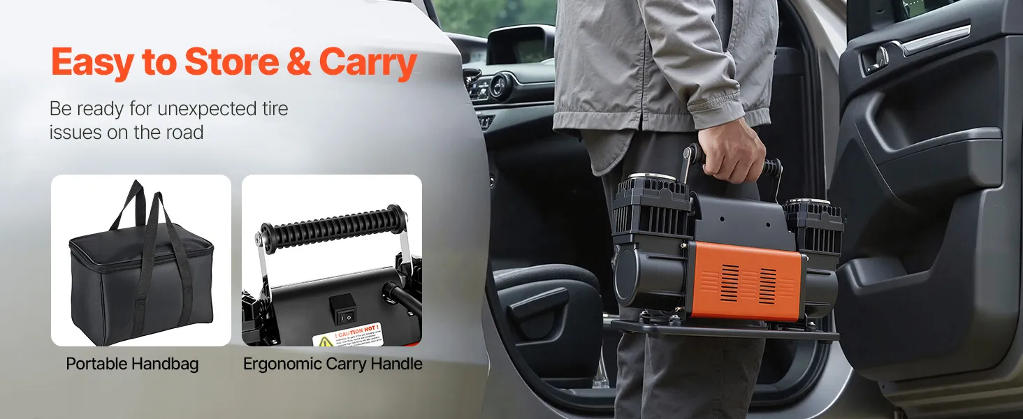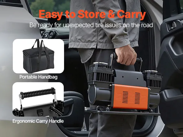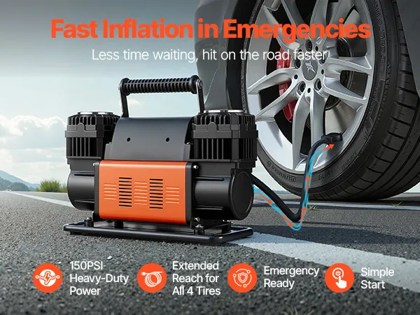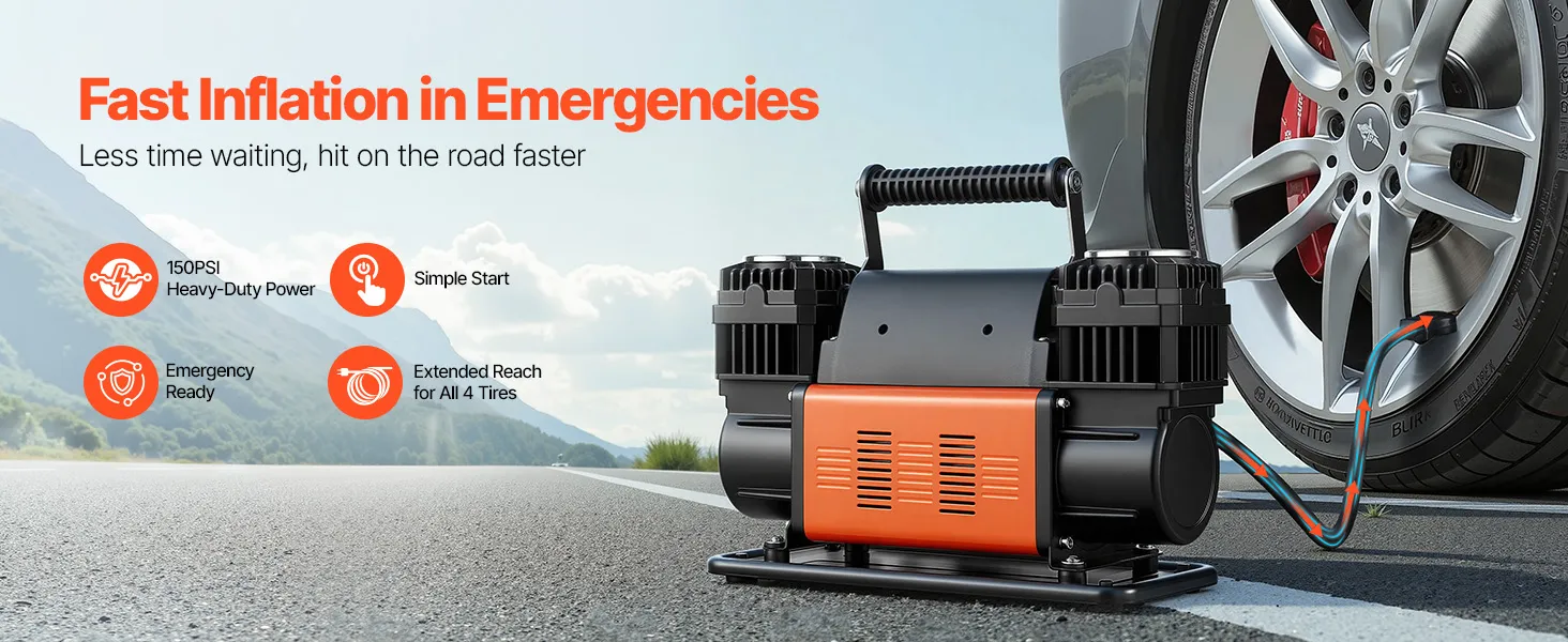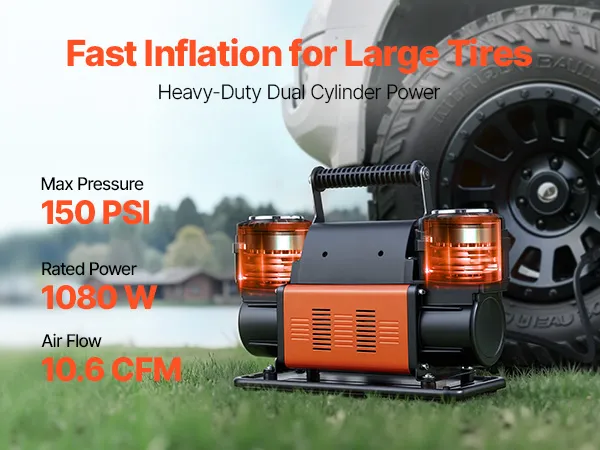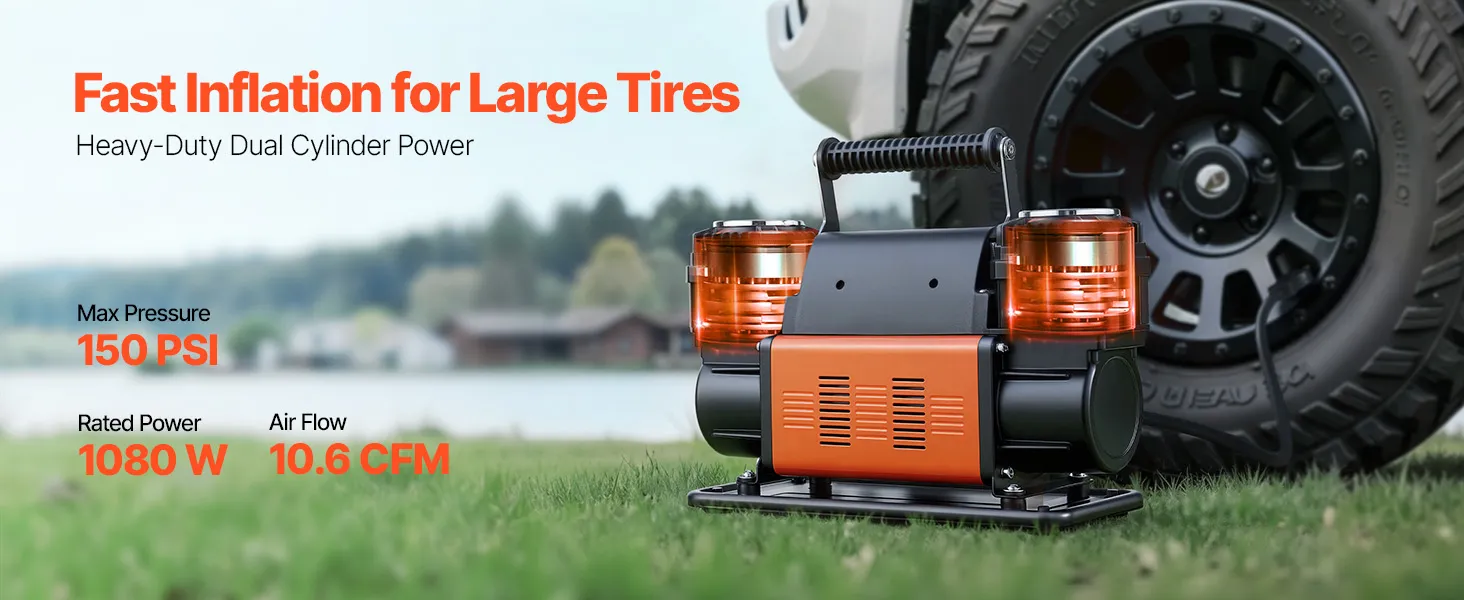El compresor de aire VEVOR de 12 V para trabajo pesado es tu compañero ideal para los viajes. Con un diseño mejorado de doble cilindro, un alto flujo de aire de 10.6 CFM y una presión máxima de trabajo de 150 PSI, infla eficientemente los neumáticos de tu vehículo, ayudándote a volver a la carretera rápidamente.