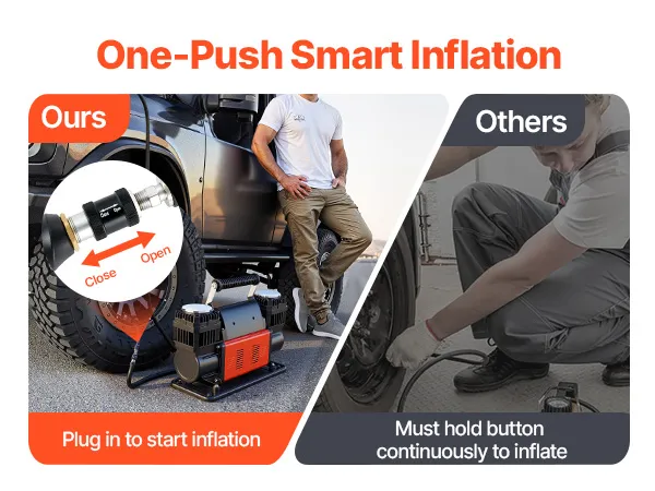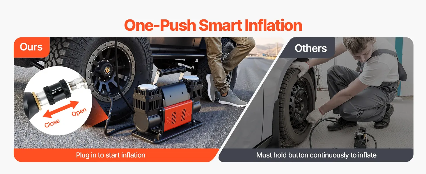 Fácil de usar: Equipado con un manómetro digital y un inflador de neumáticos, basta con presionar la válvula para "abrir" y lograr un inflado continuo. Esto permite un inflado eficiente y un control de la presión en tiempo real, sin necesidad de encender y apagar el compresor de aire repetidamente.