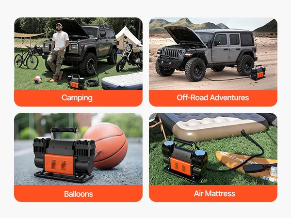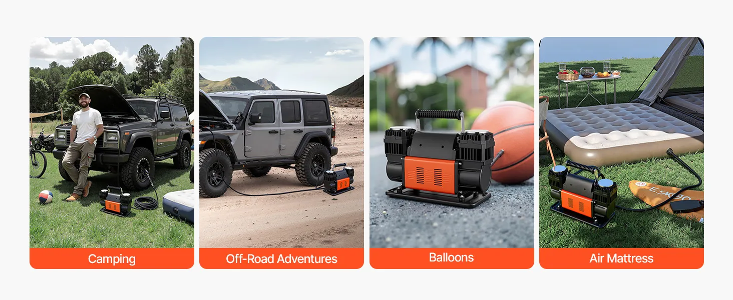 Equipado con adaptadores de inflado, este compresor de aire portátil es versátil para automóviles, SUV, camiones y vehículos recreativos, y también es adecuado para motocicletas, bicicletas, balones deportivos, juguetes inflables, colchones de aire y más.