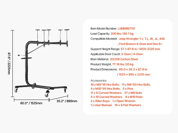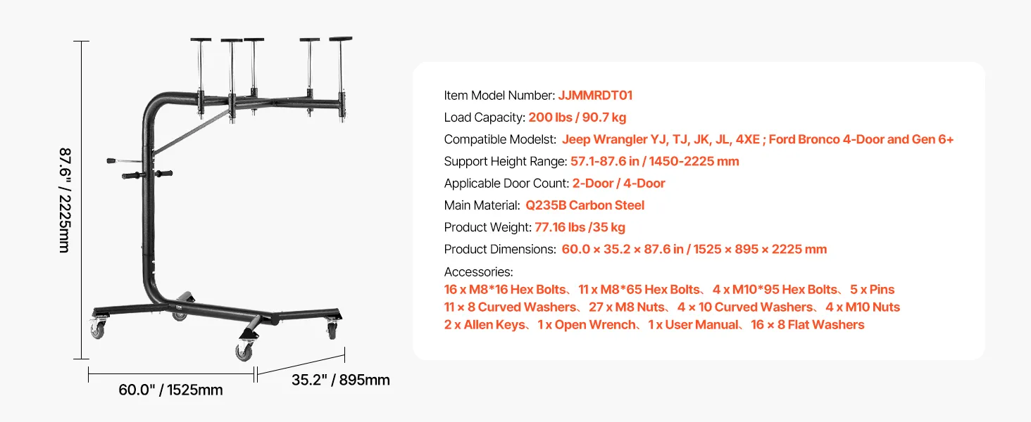 Designed for Jeep Wrangler and Ford Bronco models, including the YJ, TJ, JK, JL, 4XE, and Ford Bronco (4-Door & 6 Gen+), it fits both 2-door and 4-door versions greatly. 57.1 to 87.6 in adjustable height, 200 lbs load capacity, 4 wheels, making garage storage and hardtop removal a breeze!