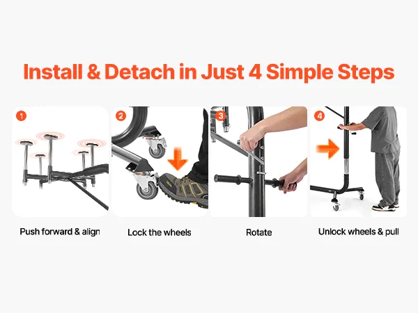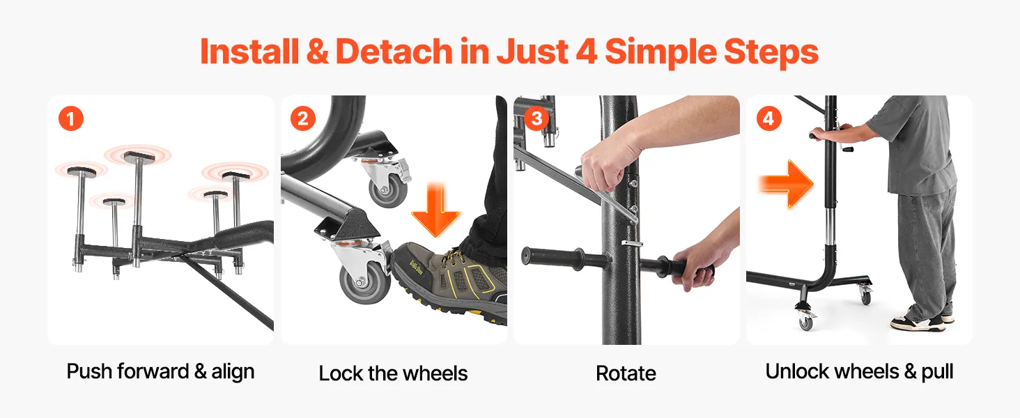 One-Person Operation: Featuring a rotating crank, one person can easily complete the hardtop removal and storage process without any additional tools. Equipped with four 4-inch wheels, the hard top remover lift is easy to move and highly portable