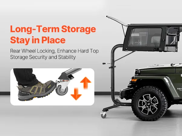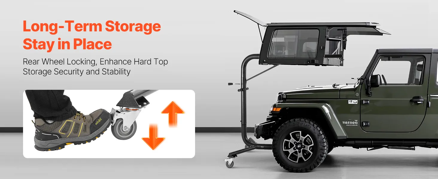 Our innovative rear wheel locking feature ensures your hardtop stays secure during long-term storage, avoiding any loosening or falling. This Jeep wrangler hard top remover lift enhances storage security and keeps everything stable, even when moving it frequently.