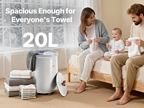 The VEVOR bucket style towel warmer has a large capacity of 20L, which fits a maximum of three oversized towels, bathrobes, or pajamas. This is what makes it ideal to share with a family in a spa. Its large interior prevents overcrowding, allowing all towels to heat evenly.