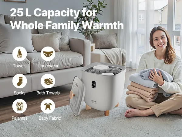 25L Capacity Towel Wamer: Fits 5 Large towels, bathrobes, underwear, socks or pajamas for 2 people in one go. Fits 6 Large towels, bathrobes, underwear, socks or pajamas for 2 people in one go. Nothing beats a cozy home spa vibe!