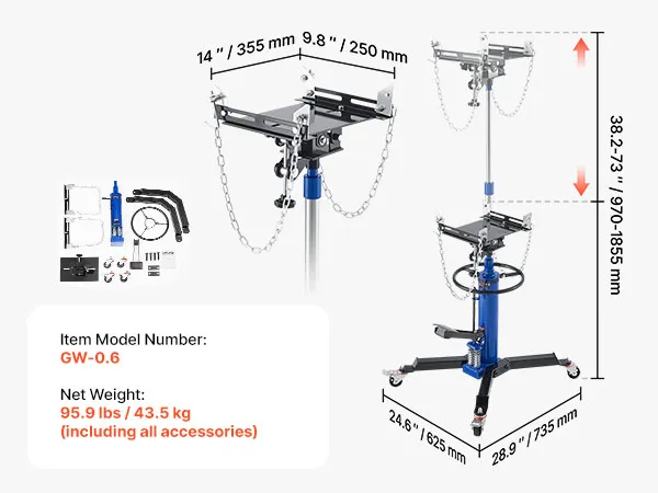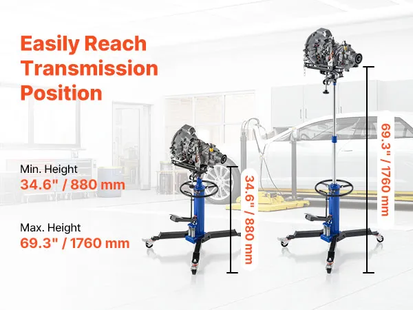 High Lifting Range: Our high lift transmission jack offers a lifting range of 34.6-69.3 in / 880-1760 mm, allowing easy adjustment to the desired height and providing ample workspace. Note: Vehicles must be supported by a car lift