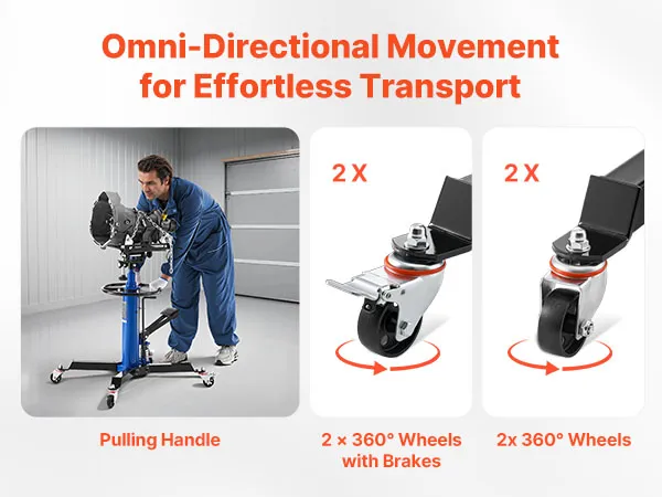 360° Mobility: The transmission jack comes with four large swivel castors (two with brakes) paired with an X-shaped base, enabling flexible movement in the garage while remaining sturdy and stable during operation. Brake locks position quickly, avoiding shift or wobble