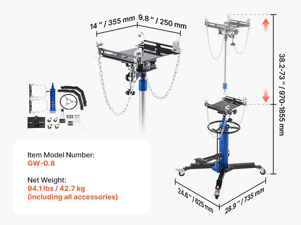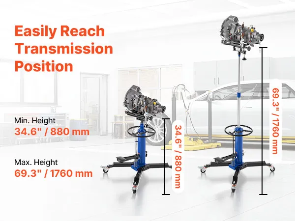 High Lifting Range: Our high lift transmission jack offers a lifting range of 34.6-69.3 in / 880-1760 mm, allowing easy adjustment to the desired height and providing ample workspace. Note: Vehicles must be supported by a car lift