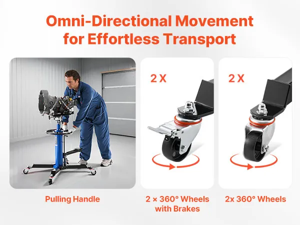 360° Mobility: The transmission jack comes with four large swivel castors (two with brakes) paired with an X-shaped base, enabling flexible movement in the garage while remaining sturdy and stable during operation. Brake locks position quickly, avoiding shift or wobble