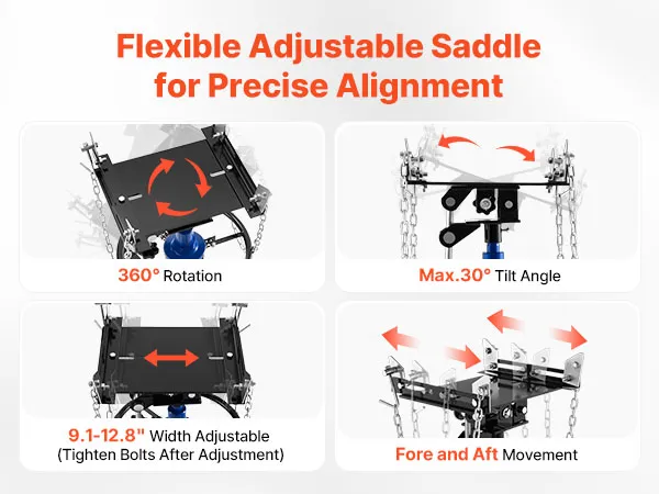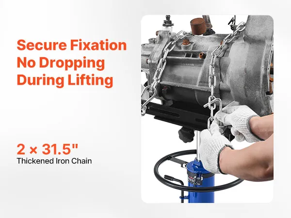 Adjustable Tray: The tray on this hydraulic telescoping jack rotates 360° and tilts up to 30° for precise gearbox alignment. The mounting plate adjusts in width to fit different transmissions, improving repair accuracy. Note: Secure parts with chains to avoid falling