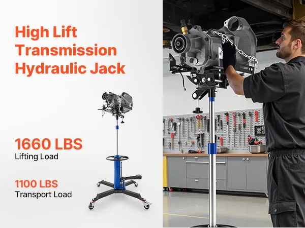 Heavy Load Capacity: The hydraulic transmission jack features a heavy-duty steel structure with a lifting capacity of 1660 lbs / 750 kg and a transport capacity of 1100 lbs / 500 kg, easily lifting transmissions, drive shafts, and axles while maintaining reliable operation