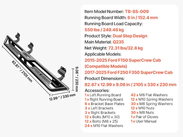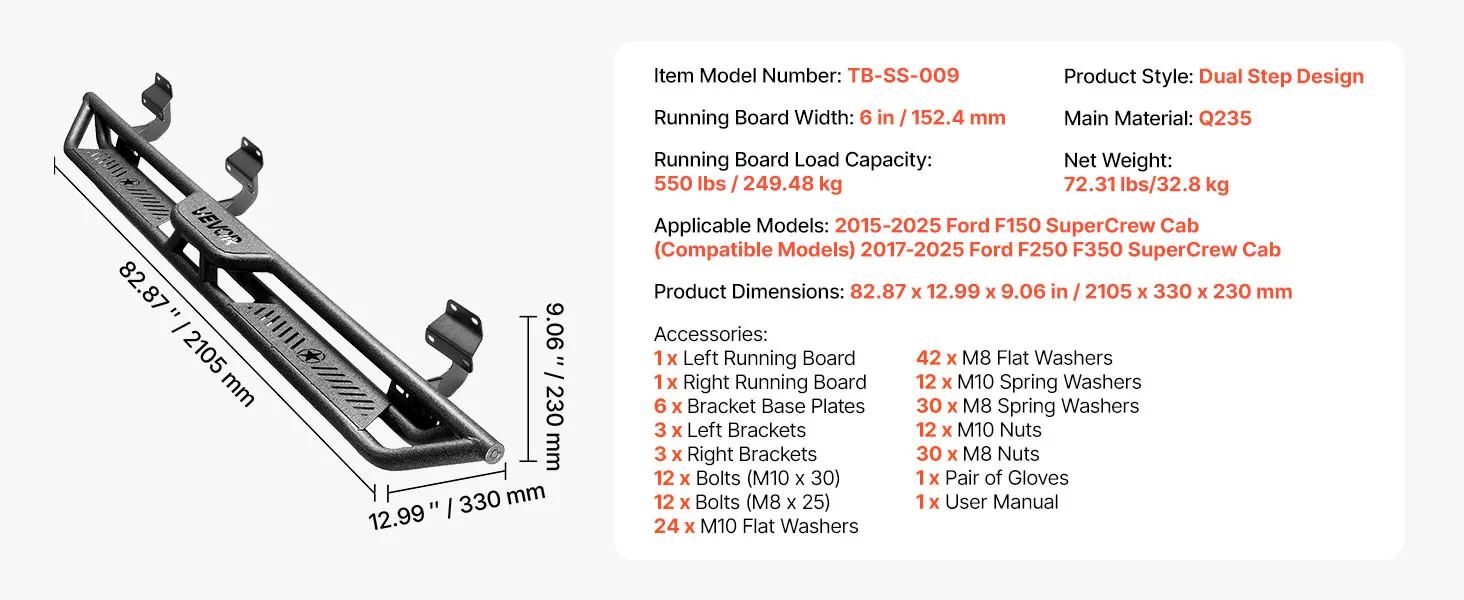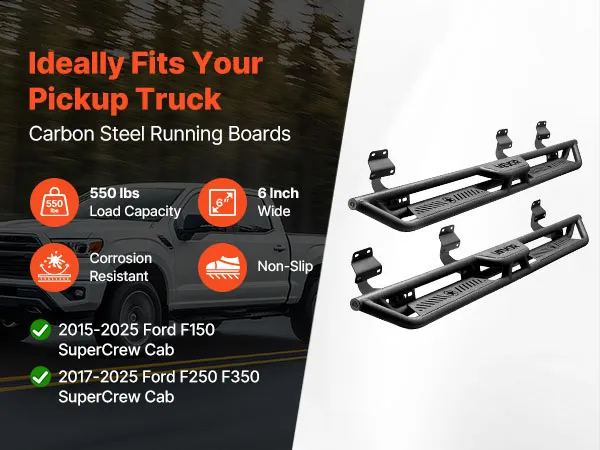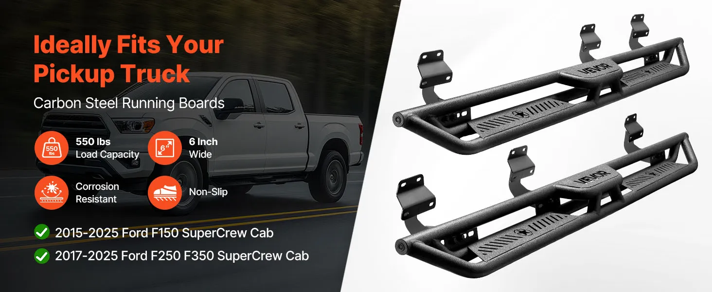 Precise Fit: These running boards are compatible with 2015-2025 Ford F150 SuperCrew Cab, 2017-2025 Ford F150 SuperCrew Cab, with mounting holes that match the factory ones 1:1. No extra drilling required—damage-free installation for a clean, OEM look