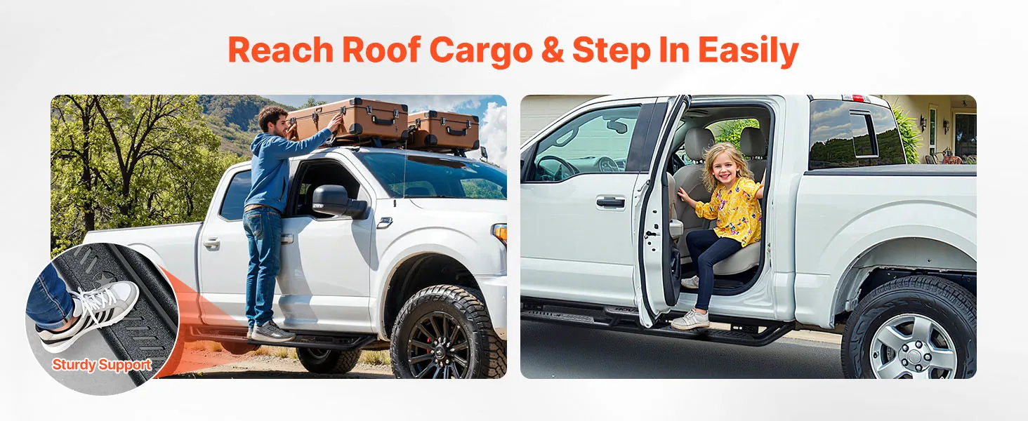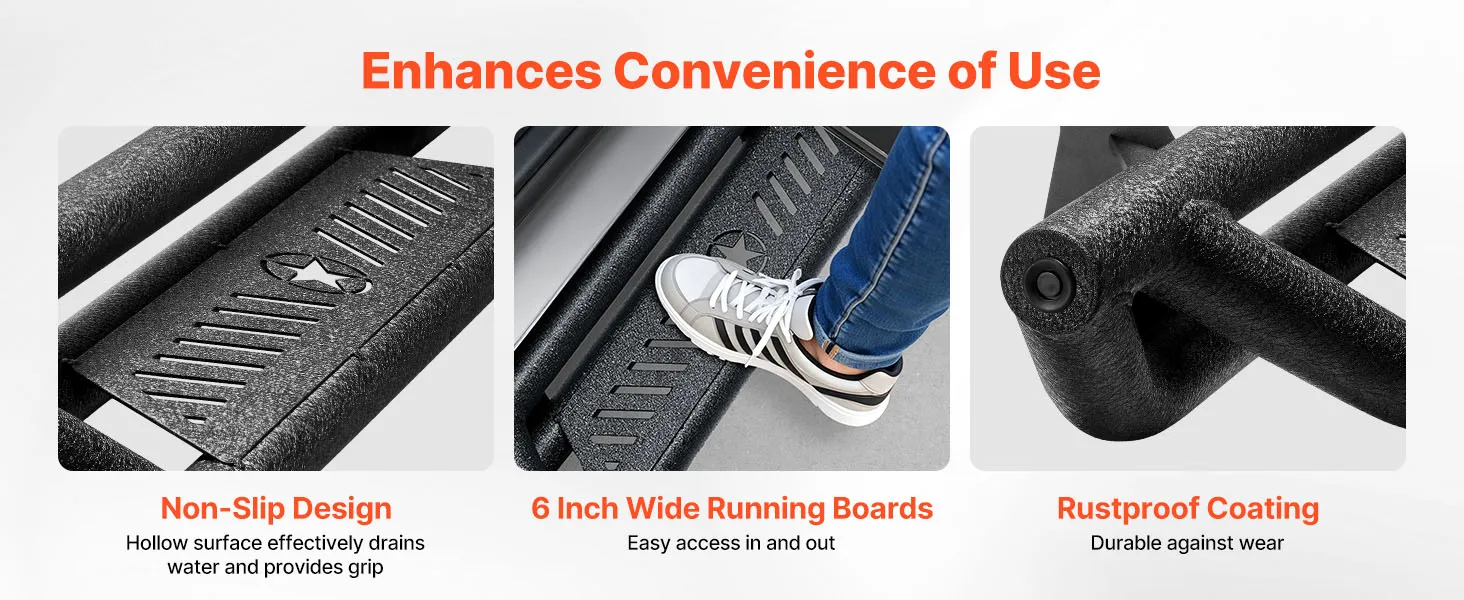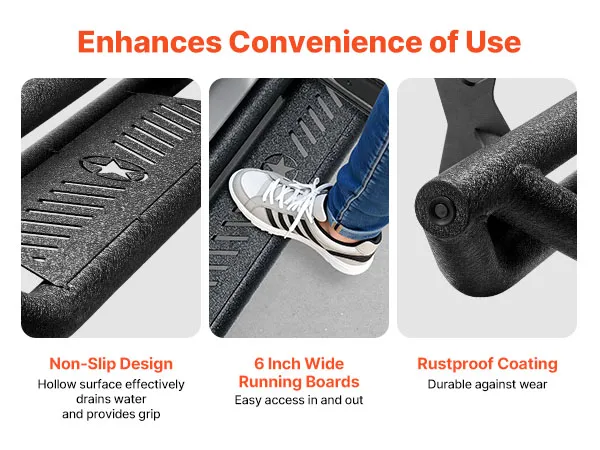 The non-slip surface of the truck steps and running boards boosts traction to reduce slip risks, while the 6-inch extra-wide step makes getting in and out easier. Rust-resistant coating provides lasting wear protection.