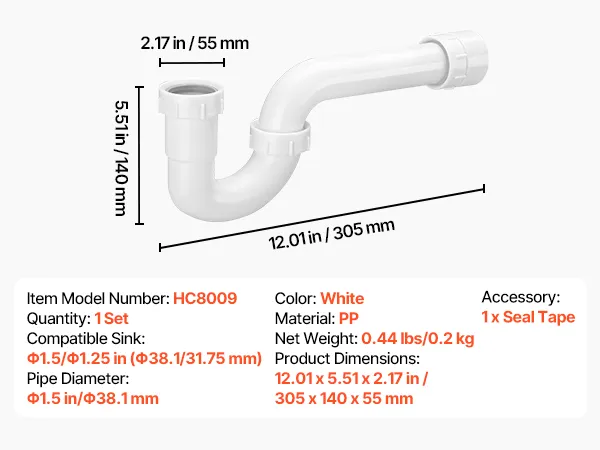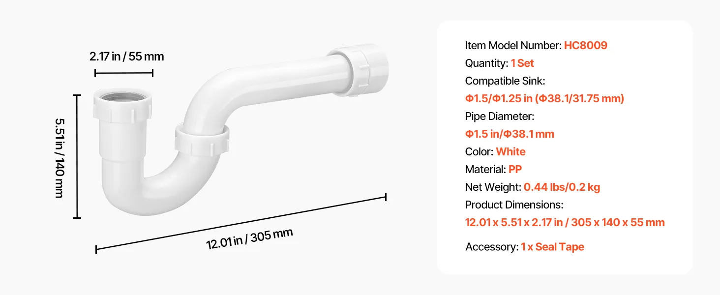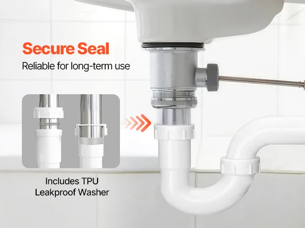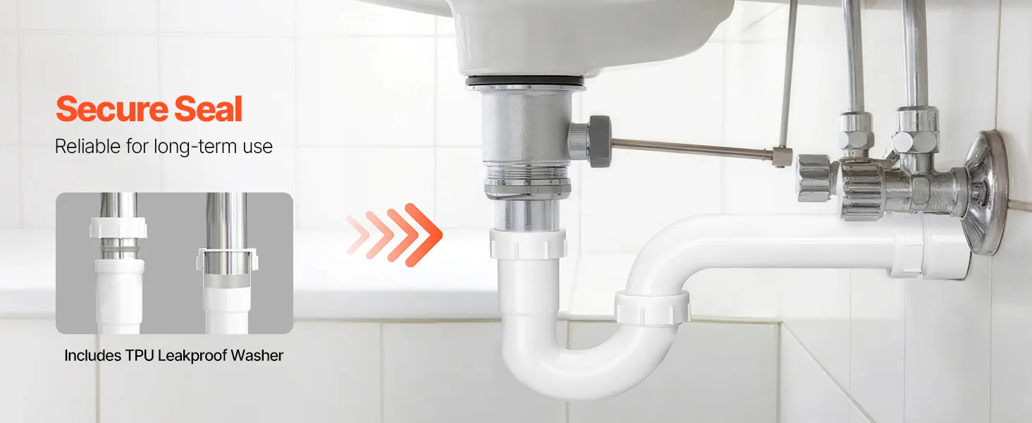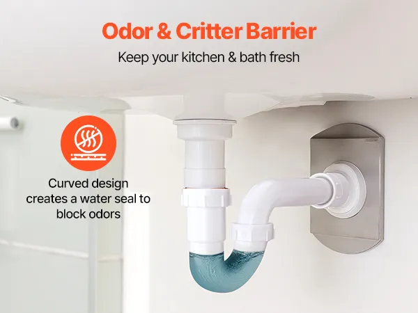 Premium Sealing: Equipped with spill-proof gaskets and locking nuts, this p-trap bathroom sink kit achieves a secure seal with simple hand tightening. The curved section creates a water seal that blocks odors and avoids critters from entering indoors