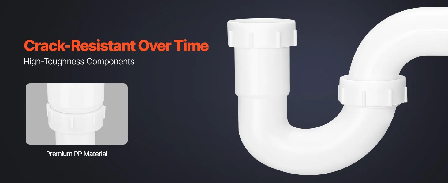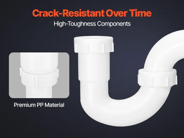 Made from premium PP material, this p-trap bathroom sink kit provides corrosion resistance and aging resistance. It is ideal for long-term use in humid conditions such as bathrooms and kitchens. It maintains high strength and toughness, keeping its structure stable without deformation or cracking.