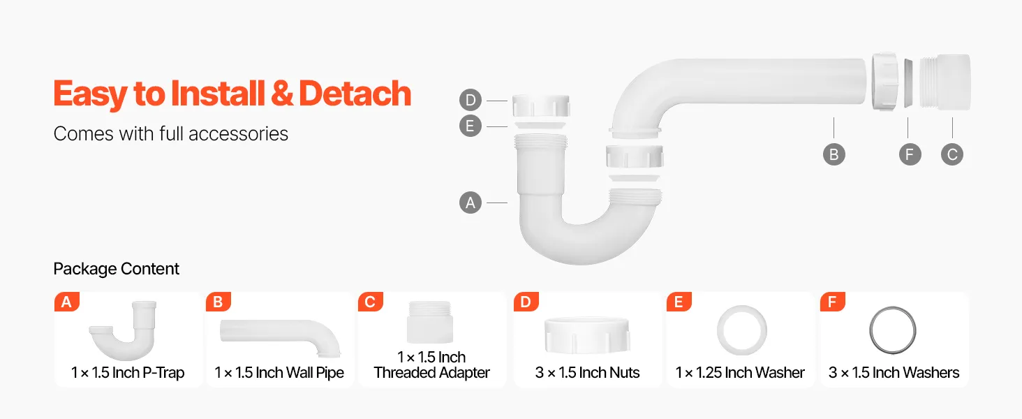 This bathroom sink trap comes with all necessary accessories. The simple installation steps allow quick setup without relying on professionals, reducing overall installation costs.