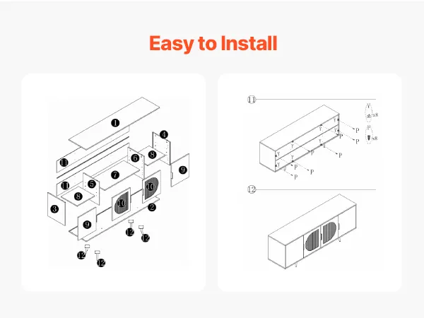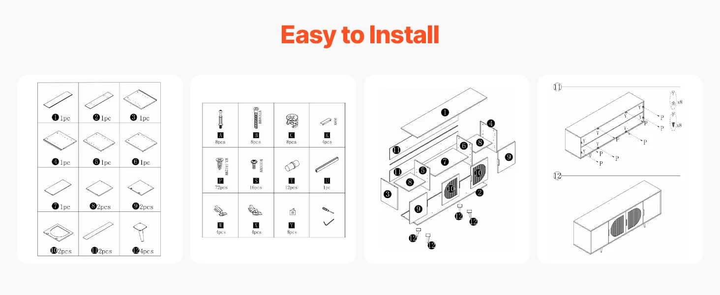 The entertainment center includes all the necessary components, including labeled parts, pre-drilled boards, and an illustrated, comprehensive handbook. Users can easily and quickly locate each part thanks to the clear labeling system, which reduces assembly errors and simplifies the process for novices. The included toolkit ensures users have everything they need to complete setup without buying additional tools.