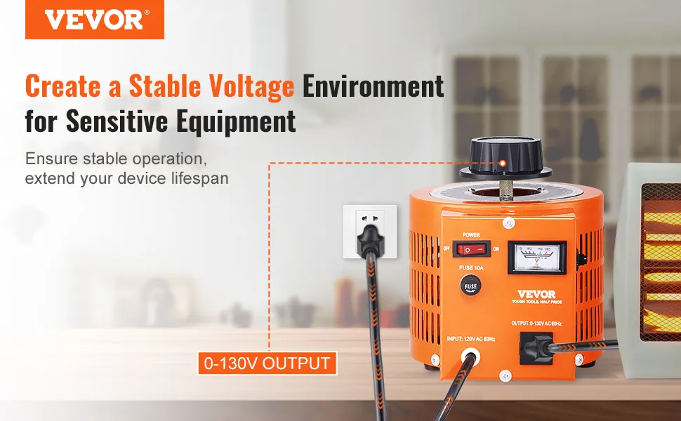 VEVOR 1000VA Auto Variable Voltage Transformer, 7.69 Amp, 110V Input 0-130V Output AC Voltage Regulator Power Supply, with 4 Extra Fuses Thermal Control Switch for Home Industrial Office VEVOR 1000VA Auto Variable Voltage Transformer, 7.69 Amp, 110V Input 0-130V Output AC Voltage Regulator Power Supply, with 4 Extra Fuses Thermal Control Switch for Home Industrial Office