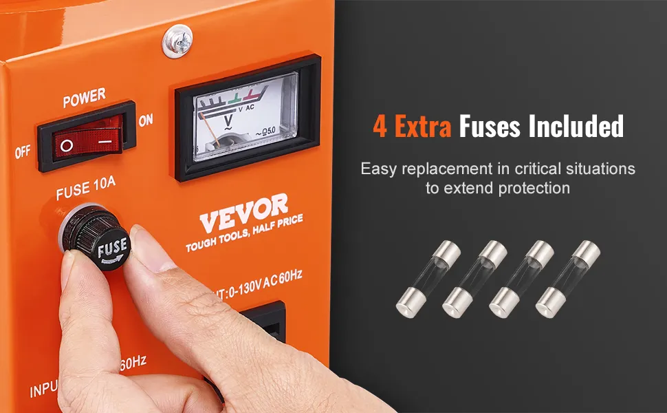 Transform your voltage with precision and peace of mind! Our variable voltage regulator offers a 0-130V adjustment range, fuses, a thermal control switch, a resettable overload protector, and , delivering a steadfast power supply.