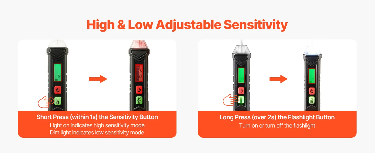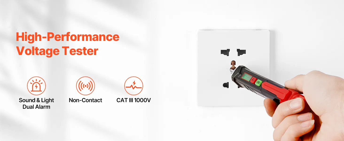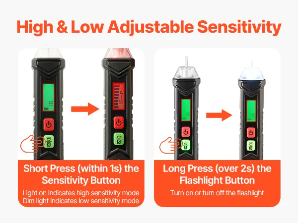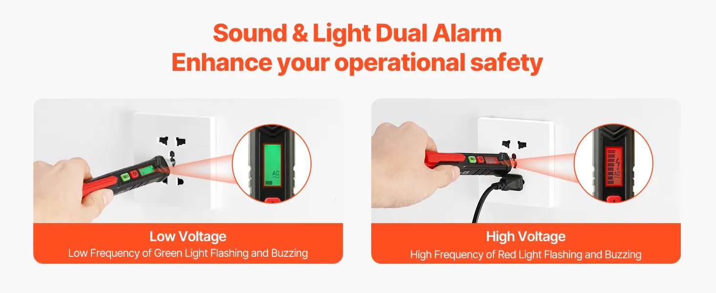 This non contact voltage tester features two alarm systems, utilizing both sound and light to provide accurate alerts. In the event of low voltage, the device flashes a green light slowly, accompanied by a beep sound. At higher voltages, it switches to a red light with a rapid, loud beep, providing a clear warning.