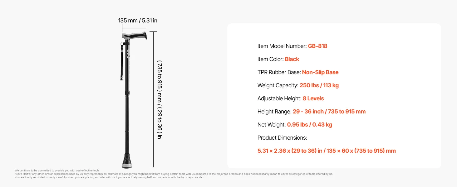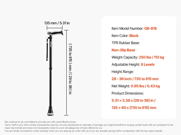 Ajuste de altura de 8 niveles: el bastón plegable ofrece 8 niveles de altura ajustables (29 a 36 pulgadas), lo que se adapta fácilmente a las diversas necesidades del usuario. Garantiza una postura adecuada y comodidad al caminar, lo que lo convierte en una solución personalizada para el uso diario o viajes cortos.