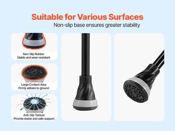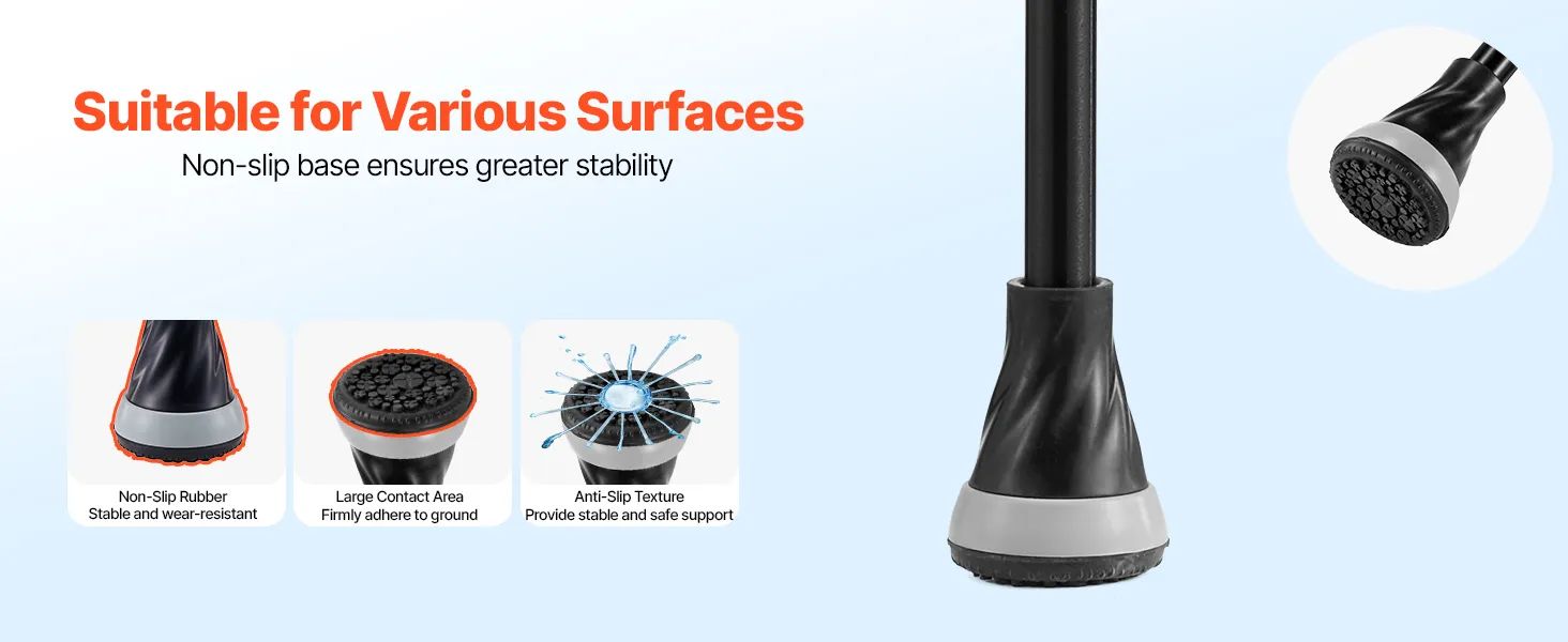 Este bastón para caminar viene con una base pivotante hecha de caucho TPR duradero, que ofrece un gran contacto con el suelo, mejor tracción y absorción de impactos para garantizar la estabilidad y la comodidad. Se adapta sin esfuerzo a diversas superficies, lo que ayuda a los usuarios a caminar con confianza y disfrutar de una experiencia de caminata más segura.