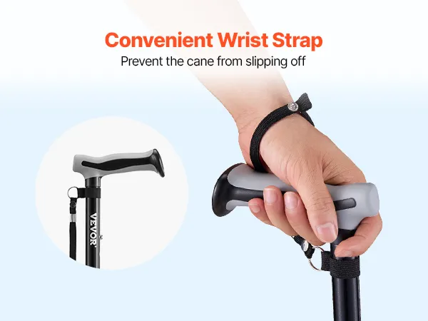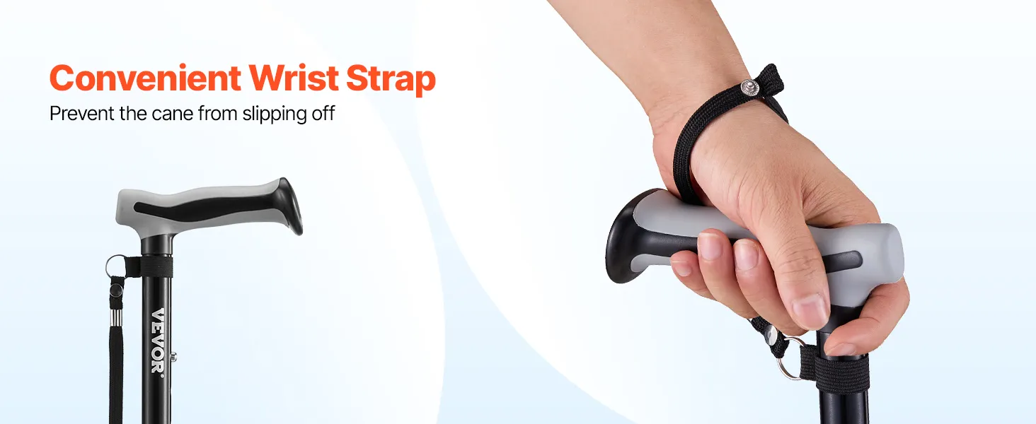 La correa de muñeca bien pensada evita que el bastón plegable se caiga accidentalmente, mejorando así la seguridad durante su uso.