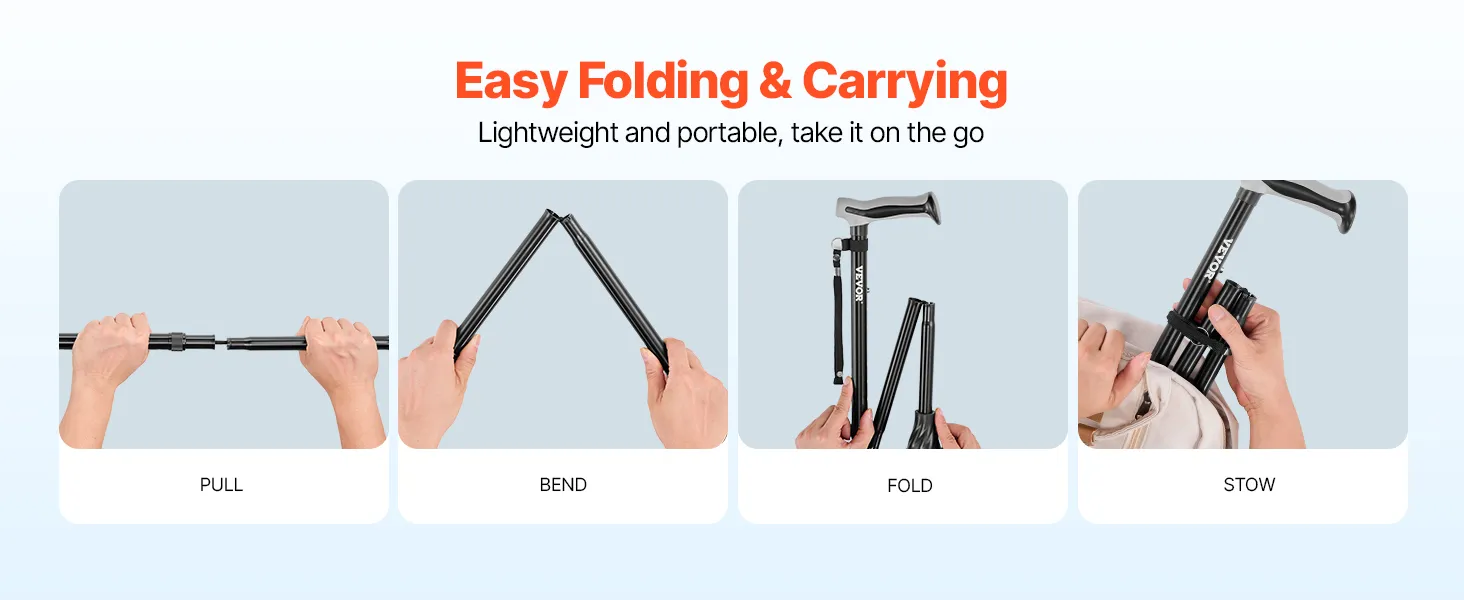 Portátil y fácil de guardar: nuestro bastón para adultos mayores es liviano y portátil, y cuenta con un diseño plegable que permite plegarlo rápidamente hasta alcanzar un tamaño compacto. Cabe fácilmente en una mochila o bolso de viaje, lo que lo convierte en un compañero confiable para las salidas diarias o las aventuras de viaje.