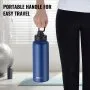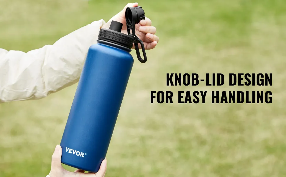 The VEVOR stainless water bottle 40 oz features a convenient carrying loop on the lid for easy transport. It is easy to hold and use due to its ergonomic shape. You can hold it, put it in your bag, or hang it on your gear while hiking or biking. The loop design makes it easy to take anywhere.
